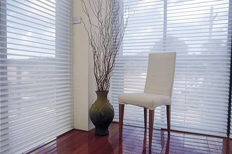 Elegant layered blinds that combine sheer fabric with horizontal vanes for a soft, diffused light.